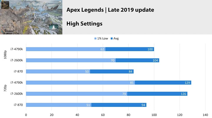 Apex Legends to przy CS:GO nowość. Jak stare procesory Intela radzą sobie w tym darmowym battle royale? Od razu postanowiłem zignorować wyniki w Full HD. Ponownie hamulcem dla liczby fps jest tu GPU. Biorąc pod uwagę tylko wydajność procesorów, okazuje się, że Intel Core i7-2600K i i7-4790K idą łeb w łeb i zapewniają płynność na poziomie nie mniejszymi niż 60 klatek na sekundę. Najniższa zanotowana liczba fps to odpowiednio 79 i 85. Niestety, pierwsza generacja nie radzi sobie już tak dobrze i zdarzają się spadki do poziomu 51 kl./s.