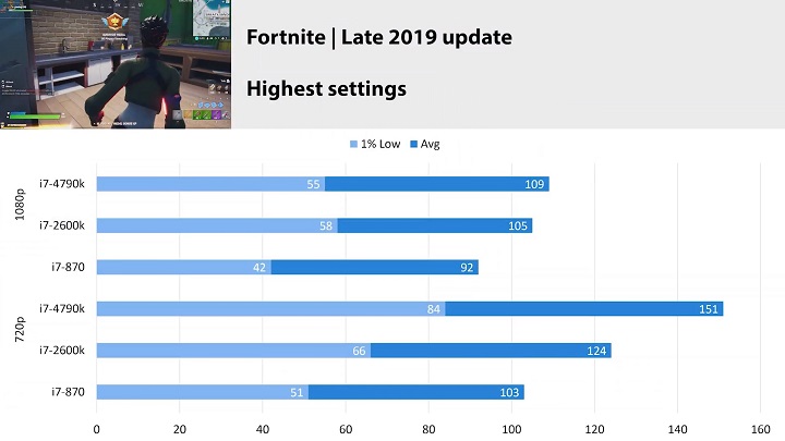 Ostatnią grą sieciową, na której postanowiłem się skupić, jest Fortnite. Wyniki są bardzo podobne do tych uzyskanych w Apex Legends. Osoby posiadające w swoich komputerach procesor Intel Core i7-2600K lub i7-4790K mają powody do radości. Układy te zapewniają wysoką wydajność, jeśli nie są ograniczone przez kartę graficzną. Średnia liczba fps przekraczająca 120 i 150 klatek bez spadków poniżej 60 zapewnia bardzo płynną rozgrywkę. Znacznie słabiej przedstawiają się na tym tle wyniki uzyskane przez i7-870. Żeby było jasne, da się na nim grać, ale należy liczyć się za spadkiem płynności poniżej optymalnej granicy.