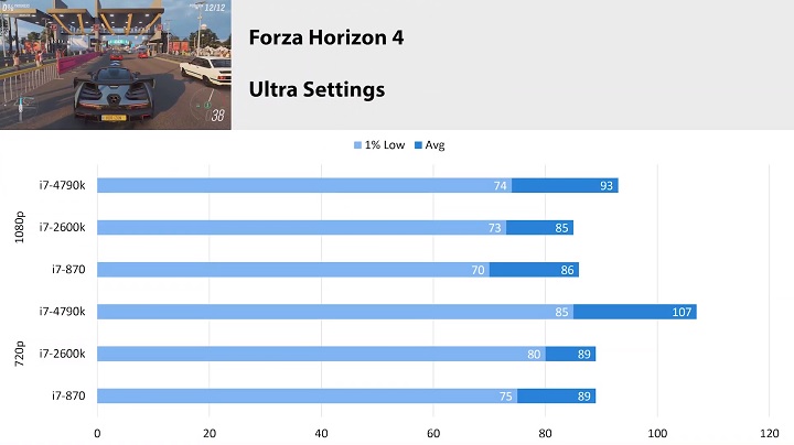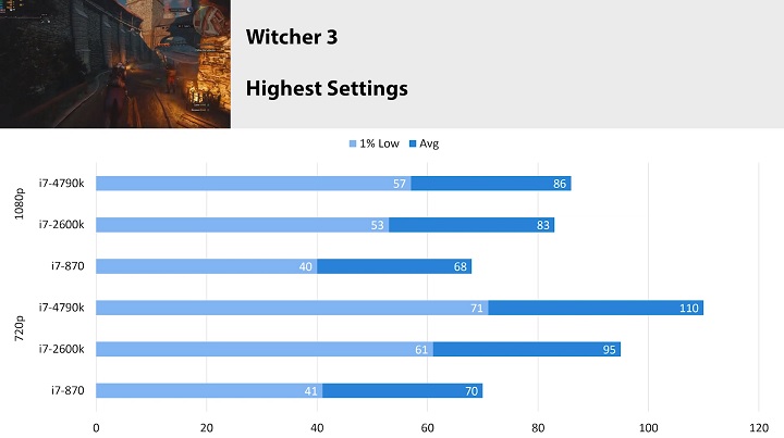 Biorąc to pod uwagę, szczególnie spodobała mi się praca, którą wykonał youtuber na kanale Kota Harp. Przeprowadził on bowiem testy w rozdzielczościach 1080p i 720p, co w tym drugim przypadku pozwoliło całkowicie wyeliminować kartę graficzną jako wąskie gardło całej konfiguracji. Stworzenie optymalnych warunków do testowania procesorów przełożyło się na miarodajne wyniki. To nie koniec dobrych informacji. Porównanie zostało przeprowadzone z udziałem innych, jeszcze starszych CPU –Intel Core i7-2600K oraz i7-870, czyli drugiej i pierwszej generacji. Okazuje się, że one również radzą sobie bardzo przyzwoicie pomimo upływu lat.
