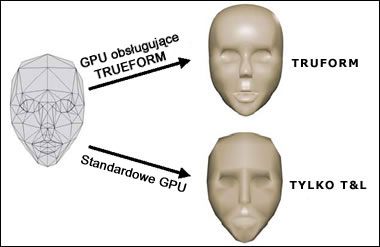 Z ciekawszych rozwiązań warto wspomnieć o TruForm, specjalnej technice zwiększającej szczegółowość obiektów 3D. Niestety, niewiele gier korzysta z tej techniki, jednak wszystkie znaki na niebie i ziemi mówią, że już w niedalekiej przyszłości większość nowych gier będzie w stanie ją wykorzystać. Podobnie sytuacja wygląda z Pixel Shaderem w wersji 1.4. Jak dotąd, tylko ATi obsługuje ten standard i na razie nie jest on masowo wykorzystywany. Poniższy obrazek pokazuje zasadę działania TruForm.