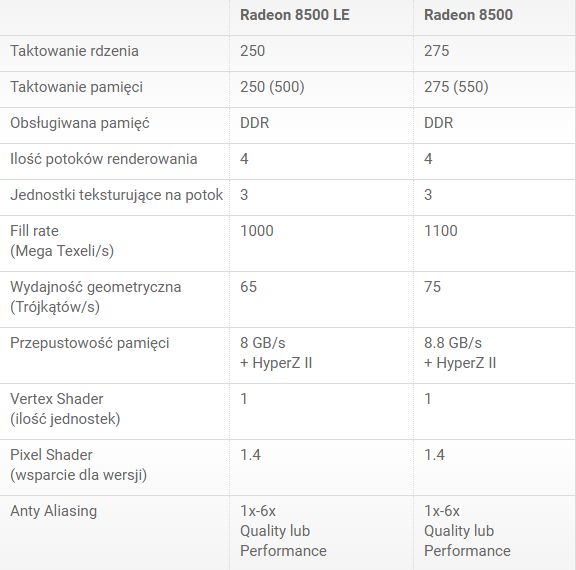 Chipy na dzień dzisiejszy są dwa: Radeon 8500 i jego słabsza wersja Radeon 8500 LE. Jak wygląda porównanie obu tych układów, możecie przekonać się nieco dalej. Poniżej przedstawiam standardowe, teoretyczne porównanie obu układów.