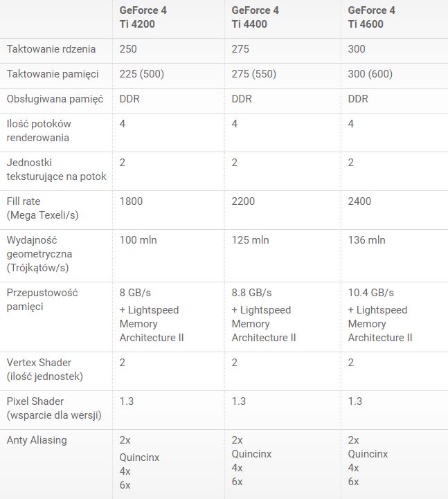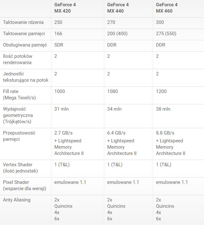 Obecnie na rynku dostępne są trzy wersje kart GF4MX, oznaczone kolejno: 420, 440, 460 różniące się oczywiście częstotliwościami pamięci oraz rdzenia. Wersja 420 jest budowana na tańszych układach pamięci SDR. Podobnie sytuacja wygląda z GF4Ti, z czego trzy wersje: 4200, 4400 i 4600 również wyróżnia częstotliwość taktowania. Jest to o tyle dogodna sytuacja, że kupując słabszy model z odpowiednim chłodzeniem możemy go podkręcić o jeden poziom wyżej. To jest oczywiście ryzykowna zabawa, niemniej jednak nie znam osoby, która by w ten sposób uszkodziła swoją kartę. Wszystko jednak musimy czynić zgodnie ze zdrowym rozsądkiem, w przeciwnym razie kręcenie wersji 4200 od razu na 4600 może zakończyć się ostatnim tchnieniem naszego nowego nabytku.