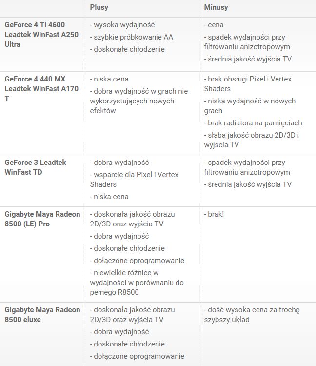 Wszystkie przetestowane karty oferują wysoką wydajność, która w zasadzie przekłada się na cenę danego egzemplarza. Odstępstwem od tej zasady są karty z GF4Ti w wersji Ti4600 – mimo wysokiej wydajności, są przeważnie dwa razy droższe niż okrojone modele Ti4200 (wolniejsze pamięci, o 50Mhz obniżone taktowanie rdzenia). Kupując wolniejszy układ dobrej firmy, można bez problemu pokusić się o jego podkręcenie.