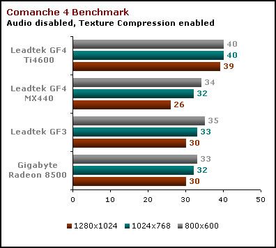 GF4Ti zyskuje tu sporą przewagę, jednak jak zaznaczyłem wcześniej, ten benchmark w dużej mierze zależy od prędkości CPU. To, oraz brak Shaderów tłumaczy wysoki wynik GF4 MX.