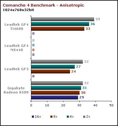 Liderem w tym teście jest, co prawda GF4Ti, jednak, jeśli porównać straty szybkości przy zwiększaniu jakości filtrowania, Radeon wypada o niebo lepiej z jego niemalże 10% stratą przy najwyższym, 16x trybie.
