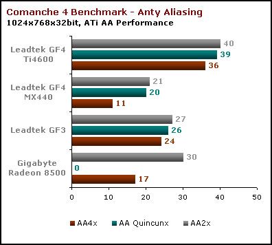 Wydajność Anty Aliasingu na karcie GF4Ti jest niesamowita. Obraz prawie zawsze był płynny przy ustawieniu 4x. GF4 MX pokazuje już swoje oblicze, niesamowicie zwalniając nawet przy najmniej wymagającym trybie. AA oferowany przez ATi ustawiony na Perfomance (wydajność) działa szybciej niż na GF3.
