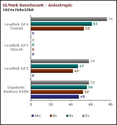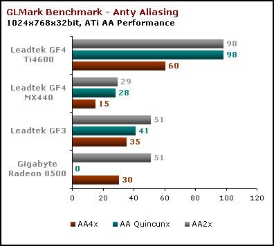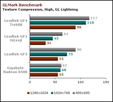 Wszystkie karty prezentują wysoką wydajność. GF3 idzie „łeb w łeb” z Radeonem, a jak zwykle góruje nad nimi GF4Ti. O GF4 MX szkoda nawet wspominać.