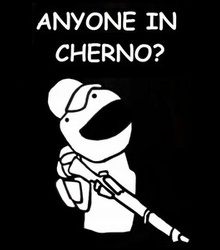 „Anyone in Cherno?” – jedno z najpopularniejszych haseł rzucanych na czacie DayZ, a zarazem kultowy internetowy mem. Odnosi się do graczy szukających przyjaciół lub naiwnych ofiar w największym mieście na Czarnorusi.
