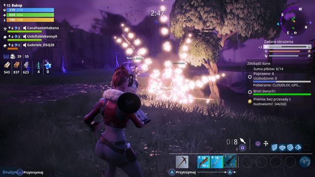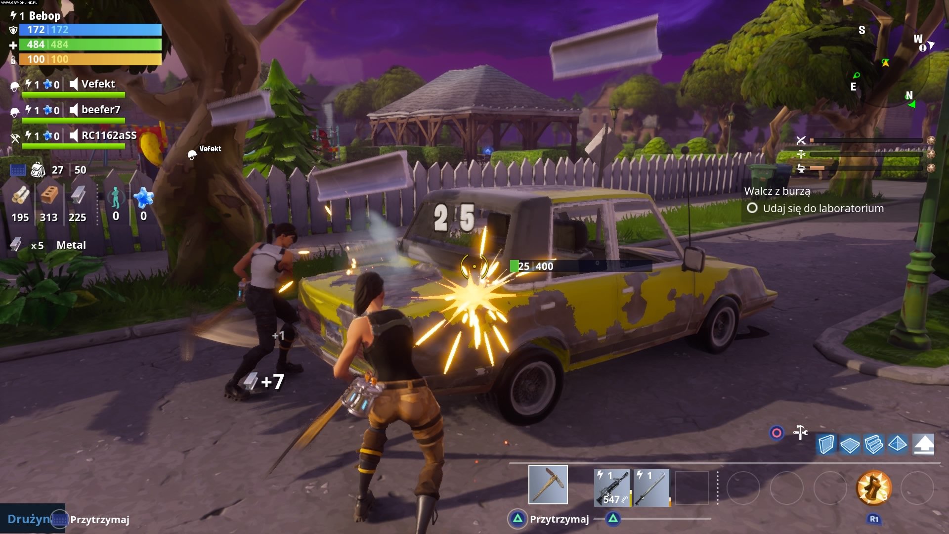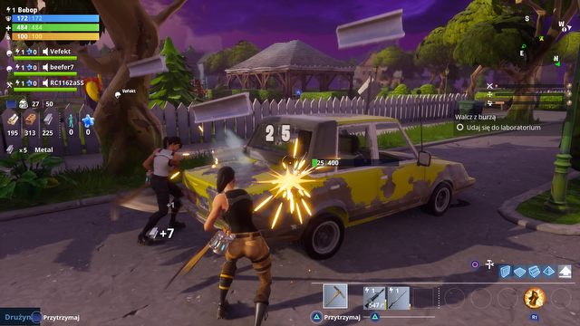W trakcji misji Fortnite przypomina trochę Don’t Starve – zbieramy dosłownie wszystko, co znajdziemy na swojej drodze, również niemal każdy obiekt da się rozebrać na czynniki pierwsze i wykorzystać powtórnie. Rozkładamy więc na części mijane samochody, pozyskując metal czy śrubki, ścinamy drzewa, dające drewno lub nasiona, a także „demontujemy” śmietniki i krzaczki. Mechanika gry jest pod tym względem fajnie pomyślana – każdą budowlę na mapie można zrównać z ziemią, a nawet zutylizować jej piwnicę. Zdobyte tak zasoby przydają się na dwa sposoby. Po pierwsze, podstawowe z nich (drewno, kamienie i metal) służą do stawiania w trakcie misji struktur obronnych. Poza tym zbieramy rzadsze surowce, które wykorzystujemy w naszej bazie, do tworzenia nowych typów broni czy pułapek. Jest to o tyle ważne, że przedmioty po prostu się niszczą – nie tak szybko jak w nowej Zeldzie, niemniej składanie kolejnych pukawek (dzielących się oczywiście na kategorie w zależności od rzadkości występowania) jest koniecznością.