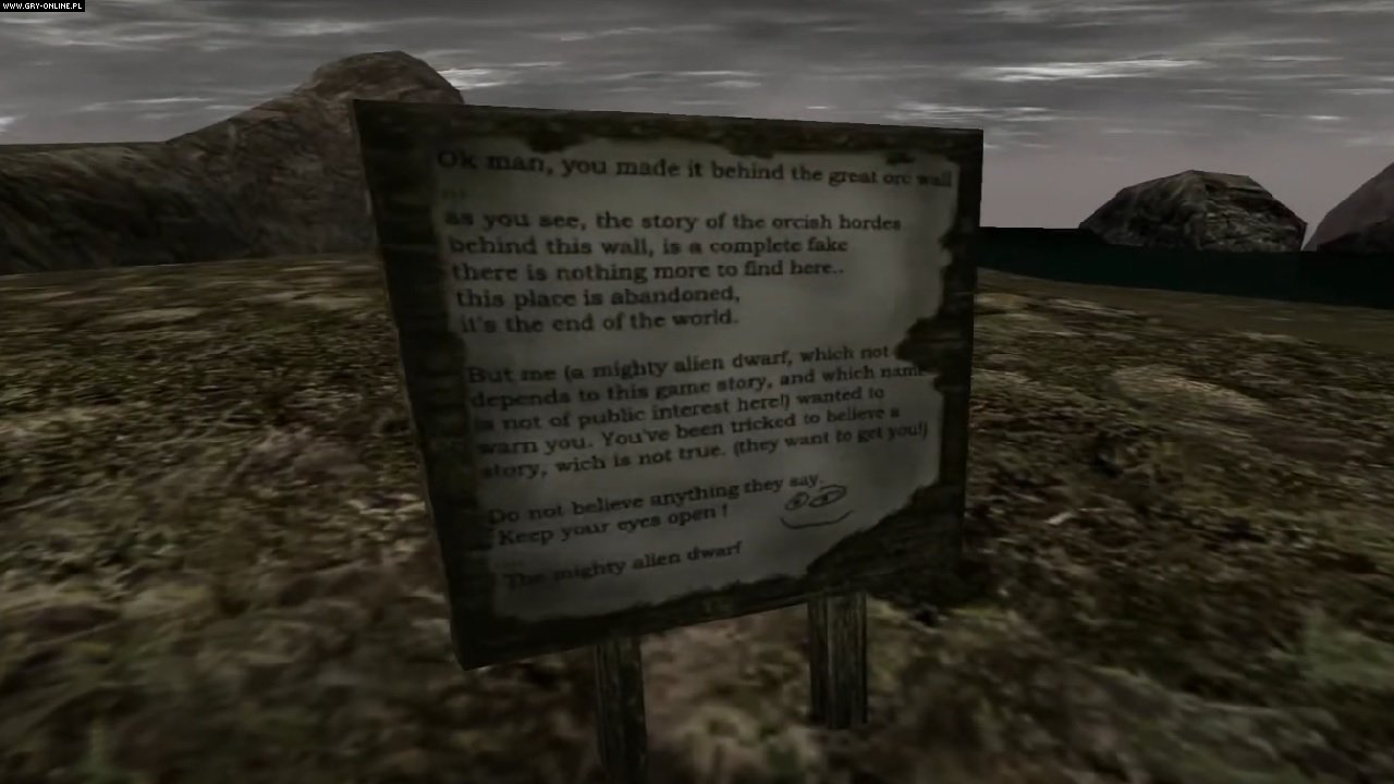 Za orkową palisadę da się przejść, w dodatku bez użycia kodów. Twórcy najwyraźniej wzięli pod uwagę przesadną ciekawość graczy, bo przygotowali się na taką sytuację. Oto komunikat, który znajdziemy w miejscu przebywania rzekomych orkowych armii (jego screen macie nad ramką). Pierwszoligowe złamanie czwartej ściany.