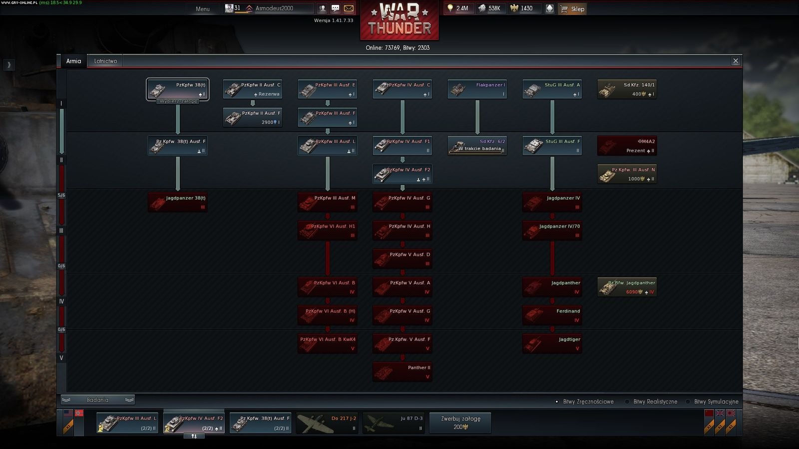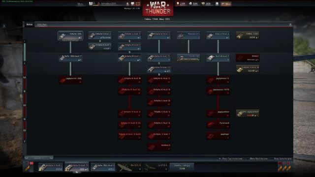 Twórcy War Thunder poszli nieco inną drogą. Po pierwsze: prawie wszystkie czołgi dostępne w grze są modelami pochodzącymi z produkcji seryjnej, które wzięły udział w rzeczywistych starciach. Niechlubnymi wyjątkami są: projekt Pz.Kpfw. VI Ausf.B mit KwK46, projekt Pz.Kpfw. V Ausf.F oraz niehistoryczna Pz.Kpfw. V Panther II. Nie licząc powyższych maszyn służących uzupełnieniu niemieckiego drzewka technologicznego (War Thunder uwzględnia również okres wojny w Korei, zaś rozwój niemieckiej broni pancernej zakończył się w 1945 roku), nie znajdziemy tutaj innych czołgów, które nigdy nie pojawiły się na polu walki. Dodatkowo każdy pojazd, jaki odblokowujemy, może być jedną z wielu wersji rozwojowych danej maszyny. Tam, gdzie w World of Tanks mieliśmy do wyboru jednego T-34 (i zmienialiśmy jego wersję w obrębie tego samego kadłuba), tak w War Thunder mamy do wyboru aż siedem różnych „teciaków”. Analogiczna sytuacja panuje w przypadku IS-ów, niszczycieli czołgów SU czy niemieckich panzerów i „kotów”. W rezultacie rozgrywając starcia, będziemy musieli skorzystać z coraz to nowszych maszyn: najpierw zagramy słabo opancerzonym Pz.Kpfw.IV Ausf.C z krótką armatą 75 mm, później trafimy na odporniejsze na ostrzał wersje F1 i F2 (z długim działem 75 mm), aby ostatecznie pokierować finalnym modelem Pz.Kpfw.IV Ausf.H chronionym przez 80 mm stali, wyposażonym w dodatkowy pancerz boczny i uzbrojonym w najlepszą dostępną dla tego czołgu broń: 75 mm KwK40 L48.