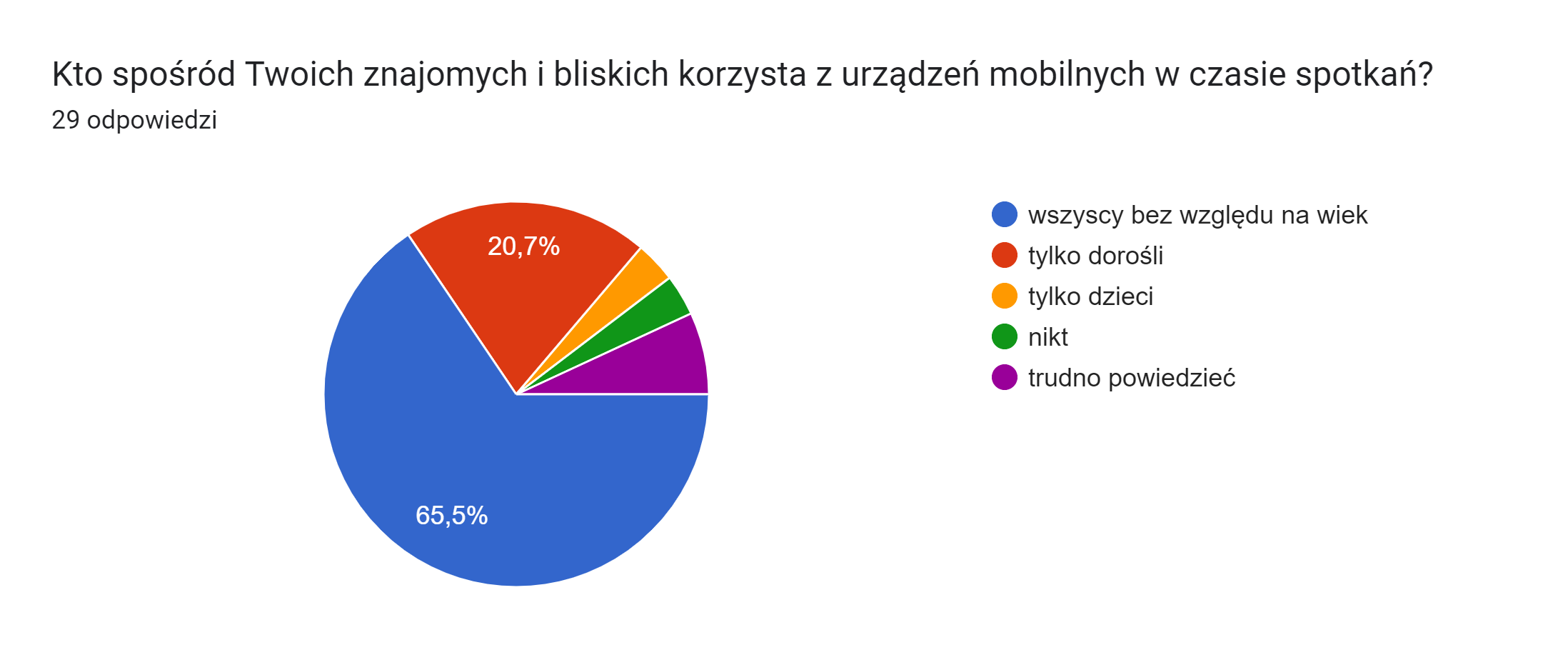 Ostatnia kwestia, którą postanowiłem sprawdzić, to czy korzystanie ze smartfonów jest w jakiś sposób uzależnione od wieku. Czy sięgają po nie głównie młodsi? Jak się okazuje nie, mniej więcej co piąta odpowiedź wskazywała, że dotyczy to tylko dorosłych, jednak zdecydowana większość badanych zadeklarowała, że wiek nie ma większego znaczenia.