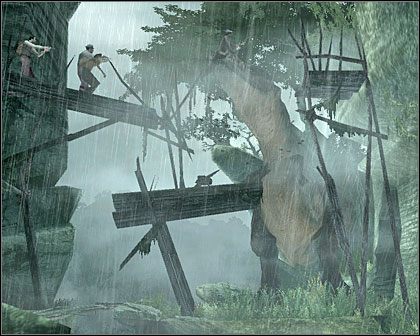 Razem z Siwym zasiedliśmy więc do dema, by sprawdzić, co z tego wyszło, przetestować grywalność i porównać grę z filmowym oryginałem. Nie sposób na razie stwierdzić, czy będzie odpowiednia ilość zróżnicowanych misji, ale jedno widać na pierwszy rzut oka: to solidny produkt, a nie reklamowy gadżet dodany do filmu! Grafika prezentuje się wspaniale, widać mnóstwo shaderów, deszcz leje jak prawdziwy, a tropikalna wyspa tonie w tajemniczej mgiełce. Nie ma żadnych kiczowatych przejaskrawień, są za to udatne stylizacje. Widać, że w zespole grafików są prawdziwi artyści, którzy wkładają duszę w swoją robotę. Bez dwóch zdań, wszystko wygląda naprawdę pięknie. Ponadto gracz uczestniczy w dramatycznych scenach, które rodzą gorące emocje. Trzeba się tylko trochę oswoić ze sterowaniem, bo gra opracowana została głównie z myślą o konsolach, jednak można w dużym stopniu dostosować klawisze do własnych upodobań. W demo można grać Jackiem, wówczas kamera ukazuje widok z pierwszej osoby, lub Kongiem, którego gracz ogląda z boku. Jako Jack ma się do dyspozycji wiele rodzajów broni, są też liczne możliwości improwizacji, bo gra jest nadzwyczaj interaktywna.