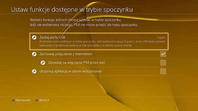 Istotną nowością w stosunku do poprzedniej generacji jest w PlayStation 4 tryb spoczynku (stand-by). Po jego wywołaniu konsola zużywa minimalne ilości prądu – w zamian jest w stanie ładować DualShocka 4 i pobierać aktualizacje systemu, a subskrybenci usługi PlayStation Plus mogą również włączyć w ten sposób automatyczne ściąganie łatek. To spora zaleta nowej konsoli – PS3 potrafiło jedynie włączyć się o wybranej porze, aby pobrać nową zawartość, a w trakcie tej czynności pracowało na pełnych obrotach. Tryb spoczynku pozwala również zdalnie wybudzać PS4 z poziomu Vity połączonej z konsolą za pomocą Remote Play.
