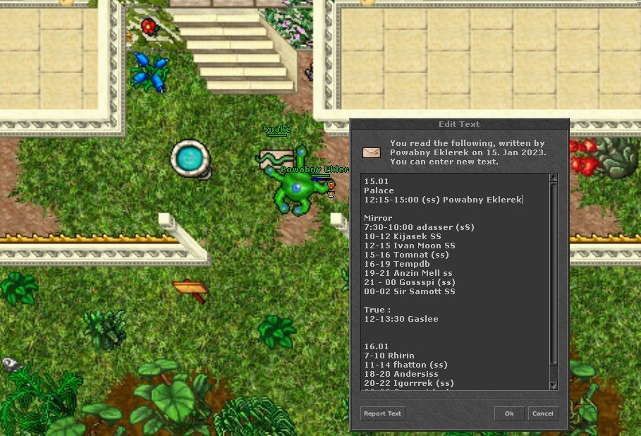 Popularne miejsca mogą być tłoczne. Na niektórych serwerach wytworzyła się kultura rezerwowania ich przy pomocy listów zostawianych przed wejściem.Tibia, CipSoft GmbH, 1997-2025.