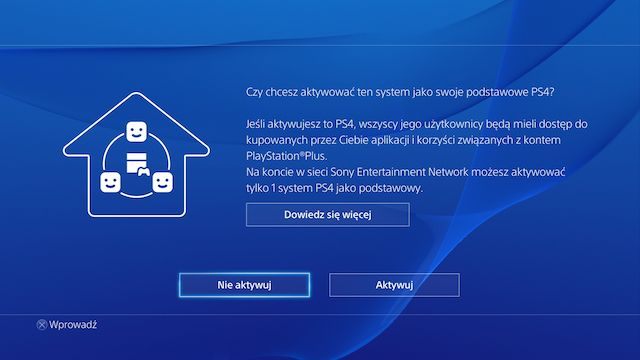 Jeżeli korzystamy z własnego egzemplarza PlayStation 4, możemy aktywować go jako nasz główny system, co da innym użytkownikom konsoli dostęp do pobranych przez nas gier. Wybieramy jedną z opcji – w razie czego można ją potem zmienić w ustawieniach konsoli.