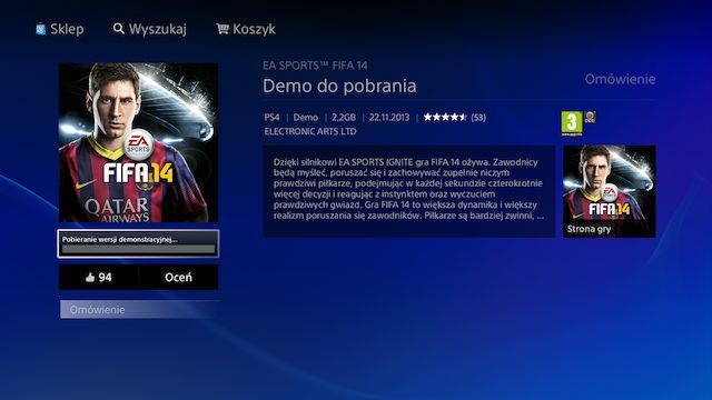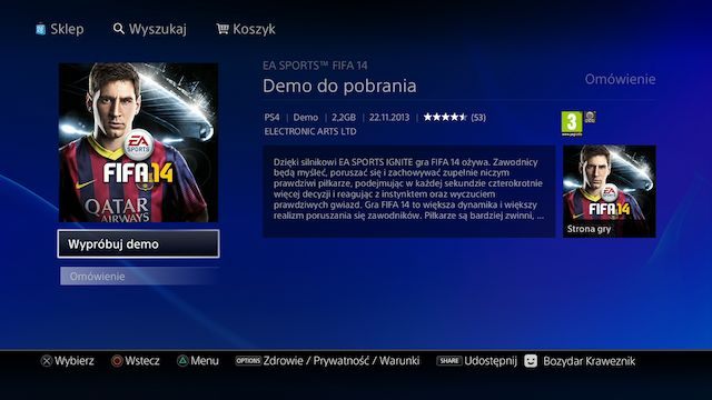 W gąszczu tytułów odnajdujemy interesujący nas tytuł. W tym wypadku będzie to wersja demonstracyjna gry FIFA 14. Gdybyśmy chcieli pobrać płatną pozycję, moglibyśmy za nią zapłacić kartą kredytową (albo debetową umożliwiającą zakupy w Internecie) lub zasilić nasz wirtualny portfel za pomocą zdrapki o wartości 100 lub 200 zł kupionej w tradycyjnym sklepie z grami.