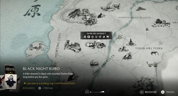 JC: Cóż, mapa w Ghost of Tsushima wygląda niesamowicie. Myślę, że jej autorzy wykonali świetną robotę. Ale wtedy nie chodziło o stworzenie ręcznie malowanej mapy. To było po prostu bardzo ładna mapa tematyczna. Natomiast [w Ghost of Yotei] uznaliśmy, że Atsu rysuje – że to są jej rysunki i jej interpretacje wydarzeń. Tak siebie wyraża, tak widzi świat. Moim zdaniem wszystkie te karty są wspaniałą okazją, aby pomóc Wam zrozumieć, w jaki sposób Atsu myśli. Podobał nam się pomysł, że wszystkie oznaczenia mapy są namalowane ręcznie – oczywiście wszystkie wykonano ręcznie przez kogoś z naszego zespołu artystycznego – ponieważ w poprzedniej grze odkryliśmy, że kiedy ikony stają się ciekawsze, ludzie zapamiętują je trochę bardziej, zwracają na nie trochę więcej uwagi. Postanowiliśmy więc, że nie tylko będą zapadać w pamięć, ale także będą wyrazem osobowości Atsu. Ta mapa jest jej mapą.