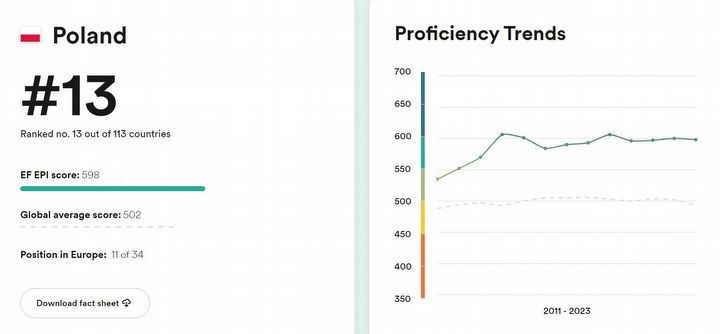 Badanie EF English Proficiency Index, które z roku na rok testuje poziom znajomości języka angielskiego w poszczególnych państwach, wykazuje, że w 2023 roku Polacy zajęli 13 miejsce wśród 113 przebadanych krajów. Grupy wiekowe 18–20 oraz 21–25 lat oceniono kolejno jako wykazujące się poziomem wysokim i bardzo wysokim.