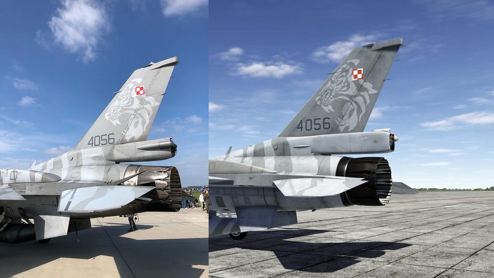 Tutaj z pomocą przyszła społeczność DCS: aby upodobnić zewnętrznie F-16C z gry do polskiego Jastrzębia, wystarczy zainstalować mod dodający do modelu 3D te wpływające na wygląd dodatki. W ten sposób samolot wzbogaci się o konforemne zbiorniki, ogon ze spadochronem (niedziałającym), a przy pewnym wysiłku – nawet o pokrywę wlotu silnika z oznaczeniem polskiej bazy w Krzesinach. Dla purystów realizmu takie modyfikacje oczywiście nie mają sensu, bo zmieniają wiernie oddany samolot w swojego rodzaju dzieło doktora Frankensteina, stanowiące nieistniejący w rzeczywistości zlepek kilku wersji (co często zarzuca się drugiemu z symulatorów F-16 na rynku – Falconowi BMS).