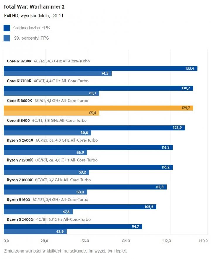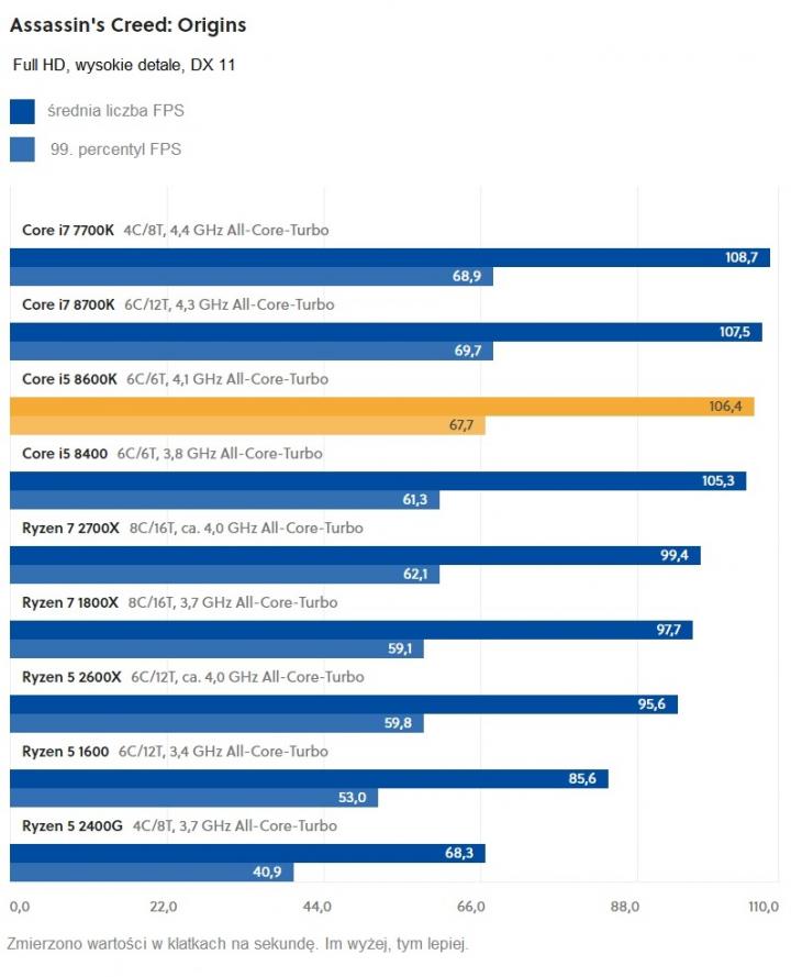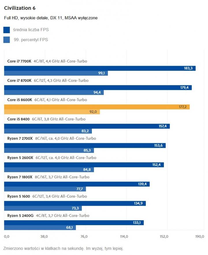 Największe odstępstwo od tej reguły zauważono w przypadku Civilization VI – gra potrafi w pełni wykorzystać możliwości, jakie daje wyższe taktowanie 8600K (różnica 300 MHz). Tę zależność można też zaobserwować w przypadku pozostałych procesorów: Core i7 7700K (4.4 GHz) radzi sobie z Civilization VI najlepiej, pomimo dwóch rdzeni mniej od Core i7 8700K (4.3 GHz). Natomiast nowe procesory AMD – Ryzen 7 2700X i Ryzen 5 2600X (oba z taktowaniem w granicach 4,0 GHz) osiągają w przypadku tego tytułu pewną przewagę nad pozostałymi Ryzenami, które „wyciągają” maksimum 3,7 GHz.