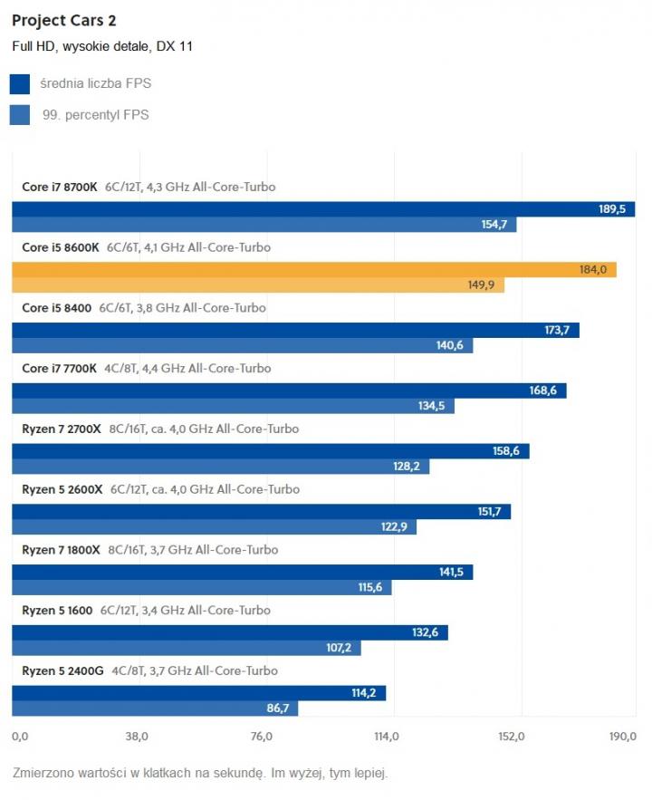 Project Cars 2 jest grą, w której przydadzą się zarówno wyższe taktowanie, jak i więcej rdzeni. W związku z tym Core i7 8700K zajmuje pierwsze miejsce. Core i5 8600K plasuje się zaraz za nim. Mimo niższego taktowania, sześciordzeniowy Core i5 8400 spycha na czwarte miejsce czterordzeniowego Core i7 7700K – ze względu na liczbę rdzeni właśnie.