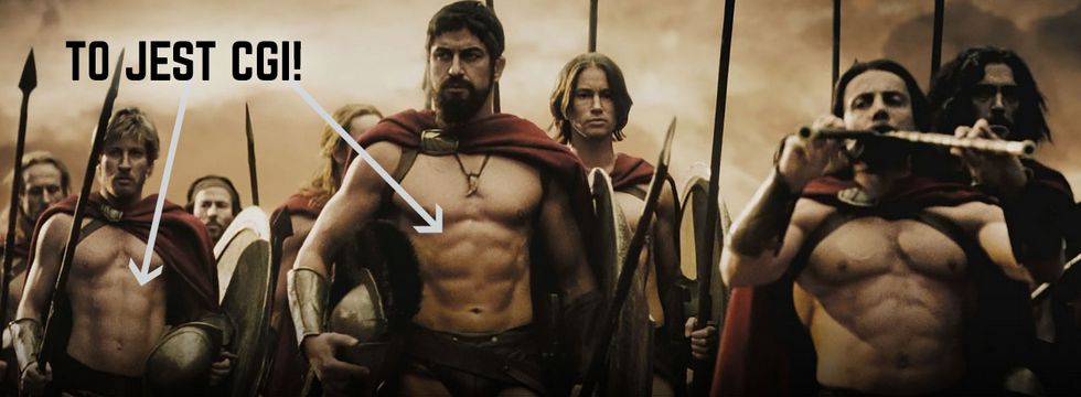 Niestety (a może i stety?) nie wszyscy aktorzy są aż tak zaangażowani w dokonywanie zmian w swoim wyglądzie. Jak jednak zagrać w filmie o mitycznych spartańskich wojach bez wyciskania siódmych potów na siłowni? CGI w 300 jest dość oczywiste, ponieważ na ekranie komputera poza aktorami wygenerowane zostało niemalże wszystko. Jednym z raczej przeoczonych zabiegów było podkreślenie – czy wręcz znaczne poprawienie – sylwetek aktorów. Takie procedury są dość powszechne, ale zazwyczaj w tym celu stosuje się po prostu odpowiedni makijaż ciała oraz dostosowuje oświetlenie. Adaptacja komiksu miała jednak być wizualnie jak najbardziej wyrazista – takie też powinny być prężące się muskuły i sześciopaki dzielnych Spartan.