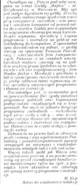 Zostawmy jednak na chwilę japońskie hity i przyjrzyjmy się polskiej prasie z tamtego okresu. W lutowym Bajtku już na drugiej stronie znajdziemy list czytelnika M. Kopa. Dotyczy on sytuacji na warszawskiej giełdzie komputerowej i doskonale opisuje ówczesne realia oraz mentalność naszych rodaków. Otóż autor chwali giełdę, dzięki której nie musi wydawać dużych pieniędzy na programy komputerowe dla syna, jednocześnie narzekając na demolkę czynioną przez, jak ich ładnie określa, Panów Pośredników (wymieniając jednocześnie nazwy firm, z których prawdopodobnie pochodzą).