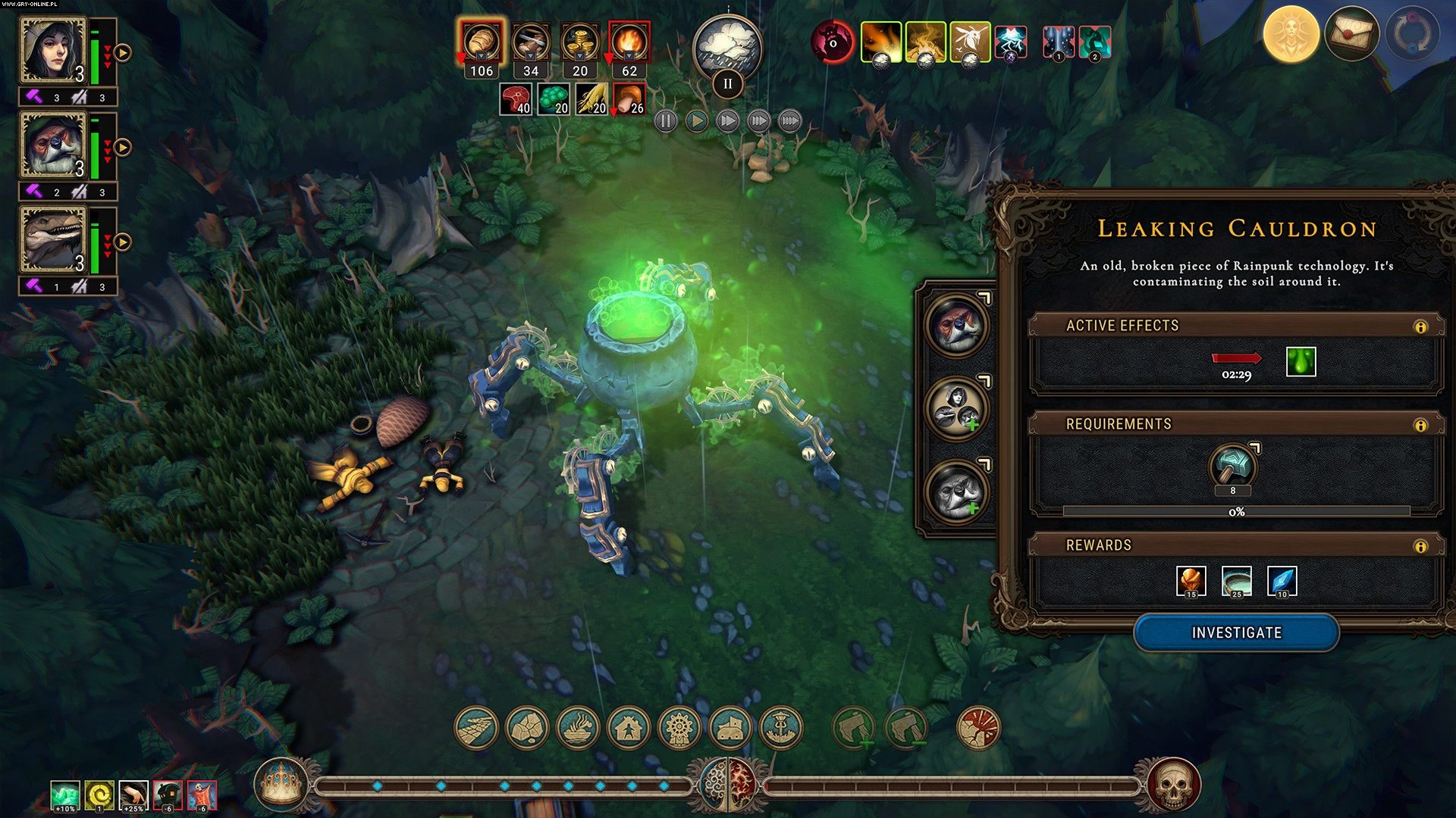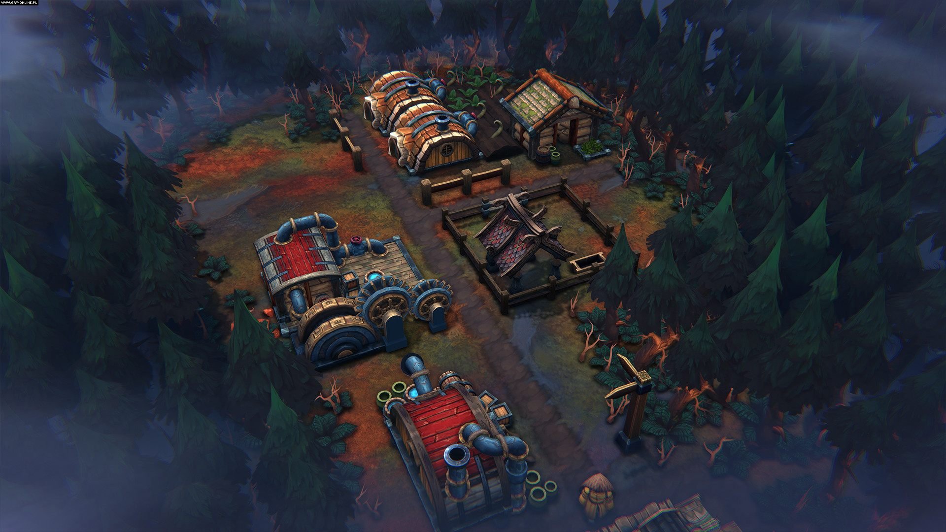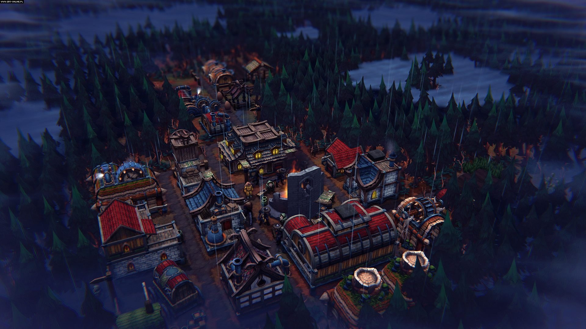 Oczywiście wspomnianych modyfikatorów, i tych randomowych, i definiowanych przez gracza, jest całe zatrzęsienie. Chociażby wybór lokalizacji przyszłej osady. Począwszy od poziomu trudności, rodzaju terenu i gleby, dostępności zasobów czy dodatkowych efektów wpływających na przebieg rozgrywki, wybór ten determinuje wielkość nagród oraz liczbę tzw. „warunków sezonowych” aka „tajemnic lasu”. Są to specjalne wydarzenia związane ze zmieniającymi się okresami, które porównać można do pór roku. W okrytym wieczną zasłoną deszczu świecie gry będą to mżawka, prześwit i burza, podczas których możemy natrafić na jedno z wielu zdarzeń uprzykrzających lub usprawniających życie naszych osadników. Wirtualna kość decyduje również o rozkładzie mapy, rozmieszczeniu zasobów, wydarzeń, ruin, skrzyń z zasobami i okrytych mgłą wojny polan, z których w dużej mierze zbudowana jest mapa.