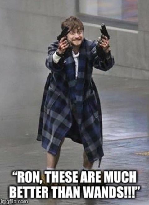 Stąd też takie, a nie inne zdjęcie. Mężczyzna nie miał jak się przebrać, więc wyszedł na ulicę w szlafroku i kapciach. Macha pistoletami, bo nie wie, jak ich używać, i... cóż, nie chce ich używać, nie chce zabijać. Jaki ma to związek z Harrym? Jako że fabuła jest zbyt szalona, by można było się jej domyślić na podstawie samego zdjęcia, fani Radcliffe’a zaczerpnęli z tego, co im znane, i zaczęli zestawiać fotkę z Potterem. Prym wśród memów wiódł szczególnie ten z przekonywaniem Rona, jakoby pistolety miały być znacznie lepsze niż różdżki.