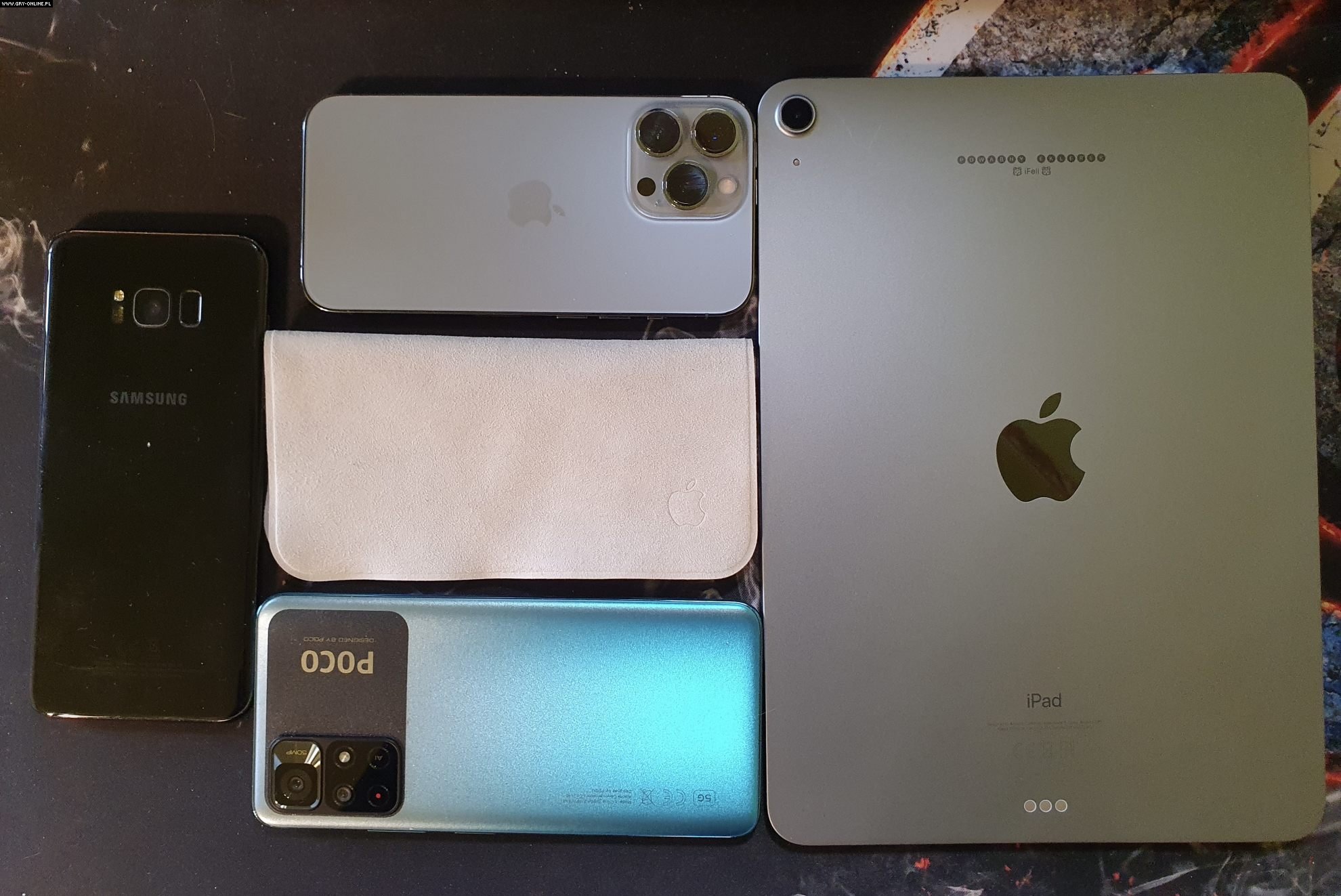 Dwa z nich, iPhone i iPad, są zgodnie ze specyfikacją producenta kompatybilne ze ściereczką Apple. Pozostałe dwa to starszy smartfon (S8) oraz współczesny budżetowy model konkurencji (M4 Pro).