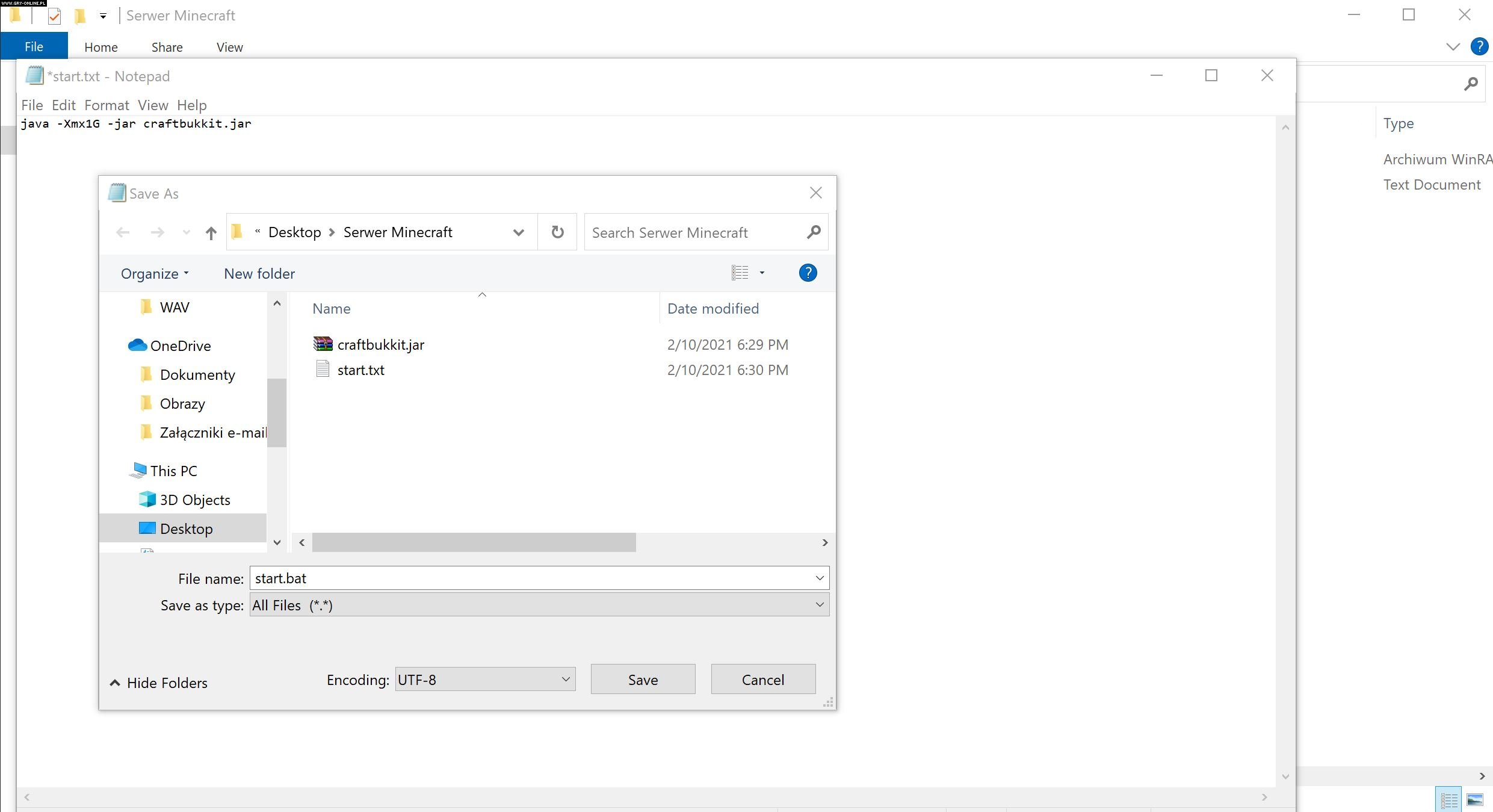 - Ważne – pliku nie zapisuj w rozszerzeniu .txt. Musisz zmienić jego rozszerzenie na .bat – tak jak na powyższym obrazku. Warto też wiedzieć, że wartość 1G oznacza liczbę RAMu przeznaczonego na obsługę serwera.