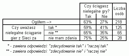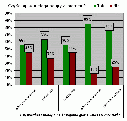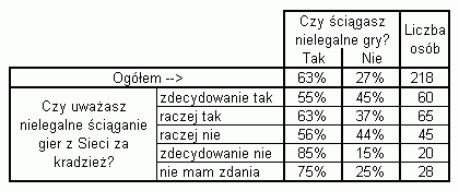 W zestawieniu najbardziej wybijającą się odpowiedzią jest „zdecydowanie nie” – aż 85% osób (uważających że nielegalne ściąganie gier zdecydowanie kradzieżą nie jest) ściąga gry z Internetu. Wyróżnienie innych zależności staje się tu o wiele trudniejsze... Jednak gdy wszystkie odpowiedzi zostaną podzielone na trzy grupy wyniki stają się już o wiele bardziej przejrzyste.