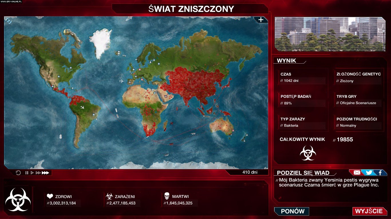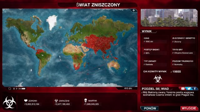Będzie to jednak wyjątkowo trudne. Plague Inc., ze swą ogromną bazą graczy oraz regularnymi aktualizacjami, mogłoby być podręcznikowym przykładem tego, jak powinno się komunikować ze zgromadzoną wokół gry społecznością oraz jak zapewniać ciągłą popularność swojemu dziełu. Ndemic Creations już pracuje nad następnymi usprawnieniami: wersją na Windows Phone oraz Xboksa One, lokalizacjami dla kolejnych języków, dodaniem trybu wieloosobowego, nowymi scenariuszami... Popularność tytułu jest tak wielka, że już wkrótce na rynek mogą trafić związane z nim pluszaki w kształcie bakterii, grzybów czy pasożytów! Plague Inc. zadebiutowało dwa i pół roku temu i od tamtej pory roznosi się niczym wirus; zarazie co rusz poddają się nowe komputery oraz telefony. Na szczęście skutki tej epidemii nie powinny być aż tak katastrofalne.