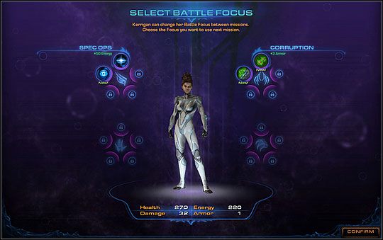 Na uwagę zasługuje także fakt, że Battle Focus może być dowolnie zmieniany przed każdą misją, dlatego sposób działania Kerrigan da się swobodnie dopasować do tego, co mamy zrobić na określonej mapie. Na podstawie zaprezentowanego przez Blizzard screena można wnioskować, że do dyspozycji graczy oddane zostaną cztery różne zestawy umiejętności. Wraz z postępami w grze, odblokujemy kolejne Battle Focusy, a obecne zyskają dostęp do nowych bonusów.
