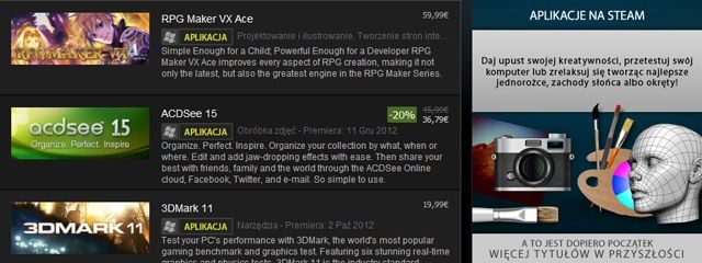 - Wprowadzenie do oferty Steama aplikacji użytkowych. Aktualnie w katalogu jest ich około 10 i są to przede wszystkim narzędzia wspierające proces tworzenia gier oraz pozwalające na testowanie wydajności komputera.