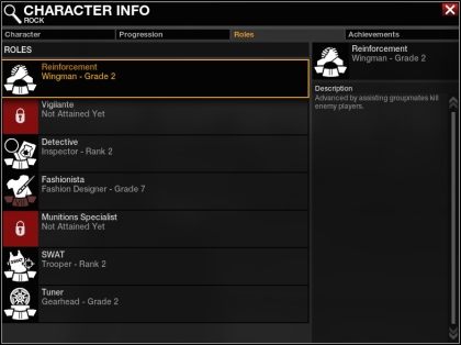 Kolejnym aspektem rozgrywki, który wiąże się z rozwijaniem postaci, jest awansowanie w różnych zawodach – rolach. W zasadzie profesje te są odzwierciedleniem tego, jakie czynności są najczęściej podejmowane przez naszą postać. Policjant może pełnić trzy specyficzne role, związane z frakcją, oraz cztery, które są rolami ogólnymi, dostępnymi dla obu stron. Poniżej znajduje się krótka ich lista wraz z warunkami, jakie należy spełnić, by awansować na wyższe poziomy: