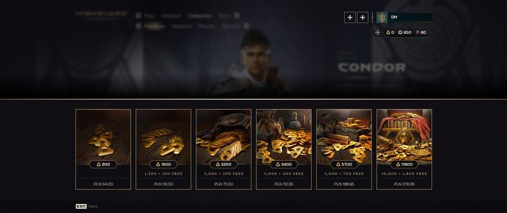 Stary numer – większość skórek kosztuje 1800, ale paczki waluty można kupić albo w ilości 1600 albo 2200.Highguard, Wildlight Entertainment, 2026.