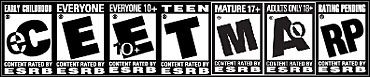 ![]() Sześć oznaczeń ratingowych stosowanych przez ESRB (oraz oznaczenie Rating Pending).