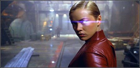 A jak wypada na tle tego wszystkiego aktorstwo poszczególnych osób? Troszkę blado. To nie znaczy, że całkiem źle. Zacznijmy od pana Schwarzeneggera. Każdy zdaje sobie sprawę, że zbyt wielu kwestii to on w poprzednich filmach nie miał. W trzeciej odsłonie cyklu nie zmienia się to w sposób znaczący, scenarzyści postanowili jednak wprowadzić dość wyraźne elementy komediowe do tej postaci. Czy wyszło to filmowi na dobre? Nie umiem stwierdzić. Jednym się spodoba, innym nie. Poza tym Arnold serwuje nam to co zwykle, czyli kamienną twarz, ruchy i gesty wskazujące nam na specyficzną jego budowę i wypowiadane monotonnym głosem znane i lubiane kwestie. Nick Stahl w roli Connora jest troszkę mało przekonujący, nie widać w nim przywódcy, którym kiedyś ma się stać. Jest to najbardziej kontrowersyjna postać, jeśli chodzi o dobór aktora. Kreacja Claire Danes także nie jest wybitną, nie poraża, ale nie przeszkadza w odbiorze. Na deser zostawiłem T-X. Kristianna Loken jest praktycznie nieznana polskiej publiczności. Nie mogę w jej przypadku także opiniować za lub przeciw, gdyż specyficzna rola maszyny, której jedynym celem jest likwidacja celu nie dostarcza materiału do oceny. Mogę natomiast ocenić urodę tej kobiety, a jest ona zjawiskowa (szczególnie na zdjęciach spoza tematyki T3 – warto dla niej przeszukać sieć moi drodzy). Przez cały film trzyma klasę, nie ma ani jednego draśnięcia, ciuszek zawsze leży jak należy, a wszystkie walki toczy obowiązkowo w szpileczkach. Biedna Kristianna – ileż ona musiała wycierpieć podczas kręcenia sceny przejścia przez ulicę w stroju Ewy. Podkreślała to w praktycznie każdym wywiadzie. Nie ma rady – musimy jej to jakoś wynagrodzić.