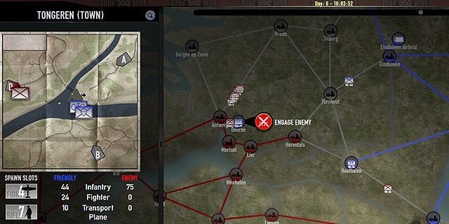 Utworzone oddziały bojowe możemy wprowadzić do walki na mapie strategicznej. Została ona podzielona na setki czerwonych i niebieski punktów, miast i lokacji, połączonych siecią linii odzwierciedlających drogi zaopatrzenia oraz możliwe kierunki ofensywy. Wszystko to tworzy nieustannie zmieniającą się linię frontu. Sama rozgrywka przypomina trochę zabawę w tytuły z serii Panzer General. Wprawdzie nie uświadczymy tu heksów, ale tak jak i w dziełach studia SSI mamy do czynienia z uproszczoną strategią, w której kluczową rolę odgrywa zajście przeciwnika z wielu stron oraz odcięcie go od linii zaopatrzenia, aby uniemożliwić mu przywrócenie posiadanych oddziałów do pełnej sprawności bojowej. Kiedy nasze jednostki dotrą do określonego celu, rozpoczyna się walka o dany punkt, co jest równoznaczne z pojawieniem się nowej bitwy na liście dostępnych gier. Samoloty i oddziały spadochronowe posiadają większy zasięg i operują zazwyczaj z lotnisk położonych na tyłach.