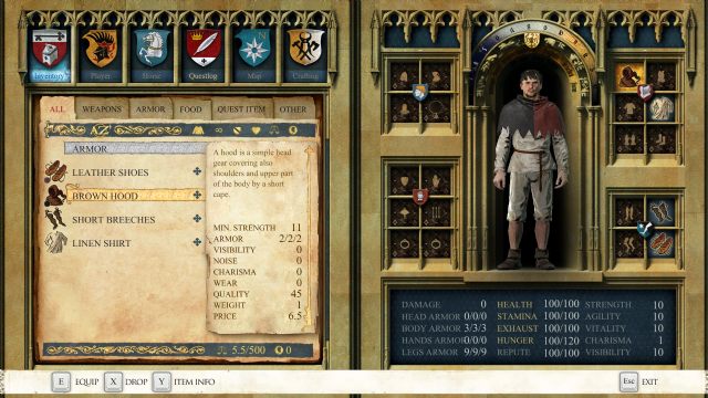 W menu postaci większość opcji, w tym na przykład crafting, jest na razie zablokowana. Można bohaterowi zdjąć ciuszki i podejrzeć ich współczynniki. Trudno w tej chwili powiedzieć, jak mnogość warstw odzienia będzie wpływała na zachowanie się postaci, ale nadzieje graczy wyrażane w licznych komentarzach są spore. Trochę szkoda, że choć model protagonisty fizycznie istnieje w świecie gry (a więc spoglądając głową w dół widzi się swoje ciało, nogi i stopy, co nie we wszystkich grach FPP jest takie oczywiste), to nie możemy go podejrzeć, jak prezentuje się z zewnątrz. Wyjątkiem są wspomniane wyżej konwersacje.