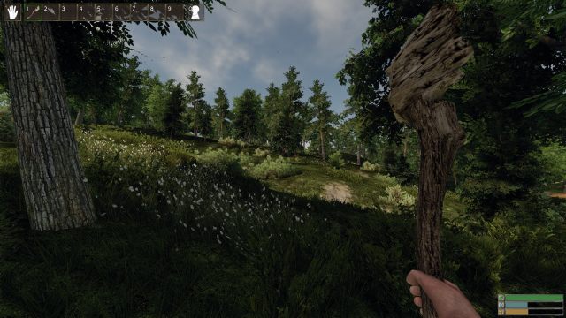 Przygodę z Reign of Kings zacząłem w dość standardowy dla gatunku sposób. Budząc się całkowicie nagi na przyjaźnie wyglądającej plaży, w ekwipunku znalazłem toporną maczugę, kilka pochodni... i zachętę, by jak najszybciej zacząć budowę własnego schronu. Podobnych mi osobników było w tym miejscu całkiem sporo – wszyscy skąpo odziani, biegali w kółko, wymachując patykami, sporadycznie tańcząc i próbując zrozumieć, co tak naprawdę należy zrobić. Po chwili radosnego hasania wzdłuż wybrzeża przyszła jednak pora na zatroszczenie się o przetrwanie. Początkowo na dobrą sprawę sprowadza się to do kilku czynności – zbierania lnu, jagód z krzaków oraz rąbania drewna. Pozyskane w ten sposób surowce pozwalają na stworzenie pierwszego schronu, jakiejś prowizorycznej zbroi i przeżycie bez większych problemów pierwszej nocy. Z biegiem czasu stopniowo odkrywamy jednak, że za pomocą posiadanych narzędzi jesteśmy w stanie zdobyć znacznie więcej dóbr – kamienie, żelazo, siano, mięso, glinę i całą masę innych przydatnych rzeczy, które następnie wykorzystujemy do tworzenia kolejnych przedmiotów.