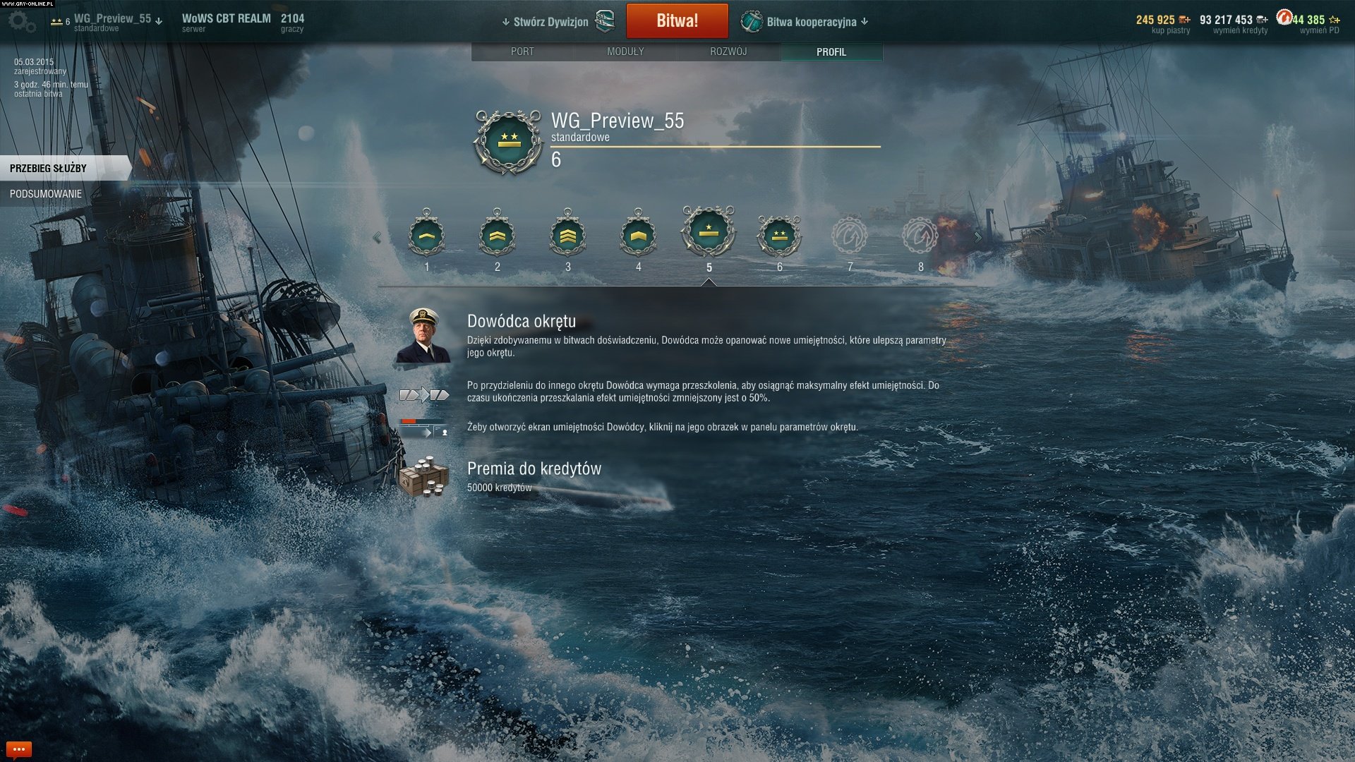 Przebieg służby stanowi kolejną nowość w produkcjach Wargaming.net, zaczerpniętą wprost z gier MOBA, a określającą poziom doświadczenia naszego konta. Zwiększamy je, rozgrywając kolejne gry – wraz z jego wzrostem otrzymujemy niewielkie nagrody pieniężne, doświadczenie oraz dostęp do dalszych trybów, dzienne misje (w stylu: wygraj 5 gier, aby zyskać 50 tys. kredytów), jak również możliwość ulepszania okrętów i zatrudniania dowódców (odpowiednika czołgistów z World of Tanks, którzy tym razem dostali własne drzewko umiejętności). Na początku jednak najważniejsze jest zdobycie drugiego poziomu i odblokowanie bitew standardowych, dzięki czemu możemy zmierzyć się z innymi graczami.