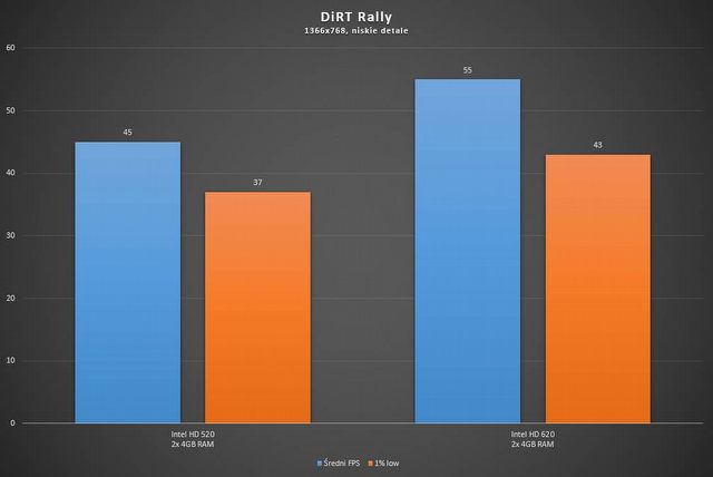 Wydajność Intela HD 620 stoi na jeszcze wyższym poziomie, ponieważ na tych samych ustawieniach otrzymamy wydajność przekraczającą 50 klatek na sekundę, co jest wynikiem bardzo dobrym. Taka płynność zagwarantuje znakomite wrażenia z rozgrywki.