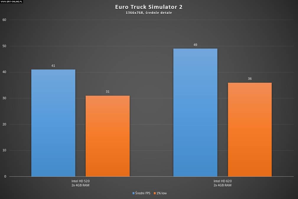 Na HD 620, na tych samych detalach, liczba fps praktycznie nigdy nie spada poniżej 30. Również średnia wartość utrzymuje się na stabilniejszym poziomie – ok. 50 fps. Oczywiście wszystko zależeć będzie od rodzaju posiadanego przez Ciebie laptopa. Słabsze konfiguracje, posiadające tylko jedną kość lub zbyt mało megabajtów wolnej pamięci RAM, na pewno będą mogły zaoferować niższą wydajność niż te, które mają zainstalowane lepsze podzespoły. Nie będzie to natomiast bardzo duża różnica, ponieważ nadal będziemy mieć do czynienia ze stabilną wydajnością na poziomie 30 fps.