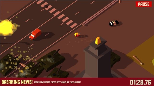Akcja ukazana jest z kamery izometrycznej i umieszczona we współczesnym mieście zrealizowanym za pomocą prostej, ale atrakcyjnej wektorowej grafiki. W grze rozgrywka polega na jak najdłuższym uciekaniu przed policyjną obławą. Zabawa toczy się do pierwszej kolizji – z innym samochodem, elementem otoczenia lub, jeśli uciekamy wystarczająco długo, pociskiem wystrzelonym przez goniący nas czołg.