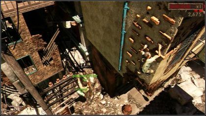 Świetne jest to, że w trybie kooperacji pojawia się również moment platformówkowy. Jeden z graczy pomaga wspiąć się drugiemu na latarnię (podnosząc go wyżej), z której tamten ma przedostać się do pomieszczenia, a następnie wyrzucić z niego kolejną szafę (potrzebną do przejścia dalej). Podczas gdy skaczemy po gzymsach i krawędziach, dwójka bohaterów na dole osłania nas przed kolejną falą przeciwników. Ci są dość natarczywi – atakują grupami z wielu stron, przeskakując mury i wydostając się z okien – choć przy tym sami często pakują się pod lufę. Dobrze posłany granat szybko unicestwi kilku z nich. Liczba przeciwników nie jest też nieskończona, bo nadchodzą oni w określonych z góry falach, przeważnie sygnalizując swoją obecność okrzykami. Jeśli zabraknie nam naboi, wystarczy rozejrzeć się po okolicy – wszędzie leży pełno różnych pukawek.