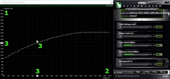 Naszymi podstawowym narzędziem będzie tutaj MSI Afterburner – bardzo popularny, darmowy program umożliwiający monitorowanie i modyfikowanie parametrów pracy kart graficznych. Pierwszym sugerowanym krokiem będzie zbadanie, jaką maksymalną częstotliwość pracy jest w stanie osiągnąć nasz laptop przed dokonaniem zmian. Jest to o tyle istotne, iż niektóre układy GPU w laptopach posiadają niestandardowo ustawione zegary. Tak też było w testowanym MSI PS42 z kartą graficzną GTX 1050 w wersji Max-Q. W trakcie stress-testu, Afterburner zamiast deklarowanego przez Nvidię, maksymalnego taktowania (1328 MHz), pokazywał aż 1476 MHz. Trwało to jednak dość krótko – po osiągnięciu przez kartę 70 stopni C, zegary były stopniowo zbijane do poziomu nawet poniżej 1100 MHz.