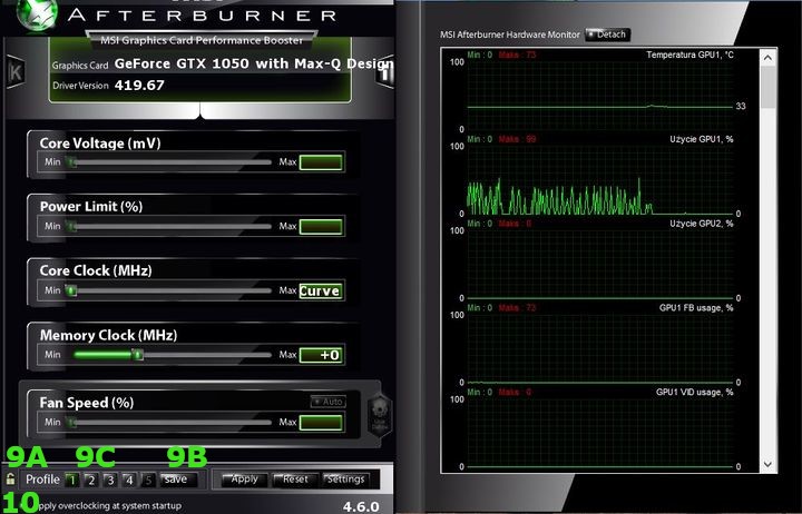 Podobnie jak w wypadku CPU, tak i tutaj musimy zbadać stabilność systemu. Sama procedura wygląda podobnie, zmieniają się jedynie narzędzia. Uruchamiamy jeden z popularnych benchmarków GPU (może być dołączony do Afterburnera MSI Kumbustor) i na maksymalnych nastawach dajemy mu około 15 minut na rozgrzanie naszej karty graficznej. Jeżeli nie dojdzie do zawieszenia programu lub całego komputera, można przyjąć wynik testu za niemal udany. Niemal, ponieważ należy jeszcze sprawdzić na wykresach Afterburnera, czy nie doszło w trakcie próby do zbicia zegarów Core Clock – poprzez obniżenie napięcia GPU powinniśmy również otrzymać wyższą i stabilniejszą pracę całego układu. Jeżeli wszystko się powidło, możemy się pokusić o ponowne obniżenie napięcia naszego GPU o jedno „oczko” w lewo [8]. Akceptujemy, testujemy i tak aż do skutku, czyli wykrycia niestabilności, spadku wydajności lub zawieszenia pracy programu/laptopa. Na koniec należy upewnić się, że nastawa tablicy została zapisana w jednym z profili [9] i zaznaczyć opcję Apply overlocking at system start [10]. Całość naszych testów możemy zakończyć długim testem łączonym GPU + CPU.